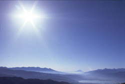 尻峠からしばらく道を下ると,目指す高原の標識が出てくる。明確な交差点があるわけではないので知らないとなかなか気付かないかもしれない。「スカイライン」と銘打たれた1.5車線の舗装林道に入ると,意外やこの時間でも高原から下ってくる車がいてすれ違いに気を使う。さらに標高が上がってエンジンの反応が怪しくなり,タイトターンでは半クラを当てる必要も出てくるが,それも草競馬場を過ぎる辺りまでだ。競馬場を越えるとようやく周囲の展望が開け,さらに北アルプスを見渡す展望台まで来ると,同じように夕日を見に来た人たちの車が何台も陣取っていた。日没までは間があるようで,太陽は山の稜線のかなり上,未だ強烈な白い光を放っている。眼下には塩尻の街。所々,ガスがかかっているが,空は不思議なほどに晴れ渡っていた。