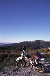 砂利の駐車場でエンジンを停める。気温はさらに下がってきているようだ。いままで登ってきた道と街を見下ろすこの場所は,さっきの展望台と同じく気分のよい場所で,さぞかしここでテントを張ったら....と思うが,ここはテント禁止だよ,とはここにある小さな山荘のご主人。国定公園になっているのでダメなんだそうだ。