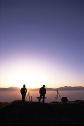 雲一つ無い空を改めて見上げるのだが,赤く染まる雲が無いせいか,あるいはこの360度の展望のせいだろうか,夕暮れだというのに,印象に残るのは赤ではなく,むしろ漆黒へと変化していく空の青さだった。アルプスの向こうに太陽が隠れ,背後から稜線を照らすと,とても細やかなその凹凸までもがくっきりと見えてくる。空気が澄んでいるからだろうか?こんなに繊細な稜線を見た記憶は,どんなに頭の中を探しても出てくることは無かった。