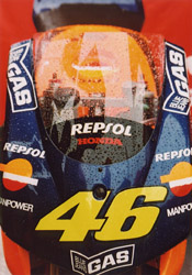 今回も結果的には彼の独走となってしまいました。序盤,スタートは5〜6番手辺りだったが,するすると一週目からイタリアン三人で逃げ始め,5週目にトップに立ってからはほぼレースをコントロールして走りきった感じ。マシンの挙動がスムーズで,それゆえリアタイヤも綺麗に流れていく,流せる....といった印象。同じくホンダに乗り換えたビアッジ選手を中盤までに突き放したカタチになったけれど,これはシーズン終盤までも見据えたビアッジ選手に対する先制パンチ....だったのかもしれません。現場ではそれほどとは思わなかったけど,ビデオで改めて見ると,やっぱり強い....全くの余裕だった,とは思われないけれど,決勝のベストラップは4秒台(IRTAテストでは4秒170を記録),なんなら3秒台でも,といった余力も計り知れないデス。RC211Vも凄いが,このライダーをうち破るのは容易ではない,とホントに思ってしまう。ヘルメットのデザインも変わっていましたネ。 menu