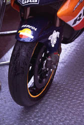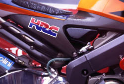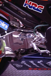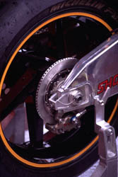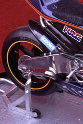 リアサス周り。見にくいですが,このマシンはサスのリザーバタンク?がスイングアーム上,リアタイアの前に付いています。