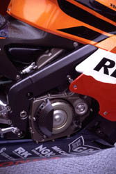 シート下の燃料タンク。リアブレーキから伸びたグリーンのホースの繋がる先,エンジン後ろバンクのシリンダーヘッドの直後に,なにやら円筒状ものが。単なるリザーバではなさそうですが....リアディスクがベンチレーティッドということと合わせると,ブレーキを使ったTCS??