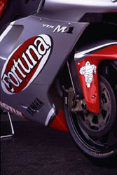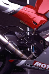 昨シーズンはビアッジ選手の手により二勝。終盤はRC211Vと互角のスピードでしたが..... フロント周り。ストロークセンサーが。 ステップまわり。見にくいですが,ステッププレートの基部には細かくポジションを移動するための穴がたくさん。いや,軽量化の穴か? シャープな造形。今回の開幕戦では新型のカウルも導入されたようです。