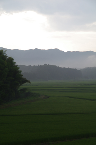 米どころであり、また原発銀座でもある....万一事故が起きたら、と思う気持ちと、それでもまた,人の死は遅いか早いかだけではないか、という気持ち。相馬の史跡と原発を明日はみて回ることができれば....と思いながら淡々と距離を稼ぐ。読み方になじみのない地名がたくさんでてきてよく分からないな....とそんなことを思いながら走っていると、目星をつけたキャンプ場の近くになっていた。西の空は太陽の光のカーテンが降りている。田畑の風景が美しい。たとえその反対側に原発の大きな煙突があっても。