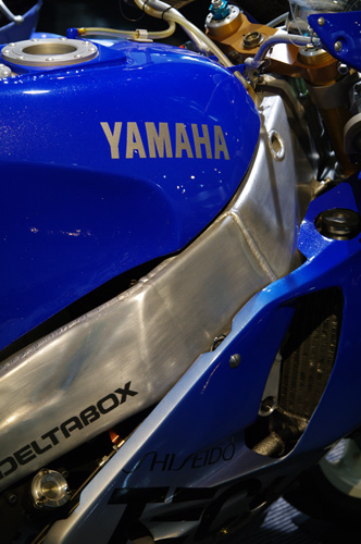 90年のYZF750のメインフレーム周り。とにかくこの頃のマシンは高剛性一直線という感じで