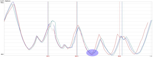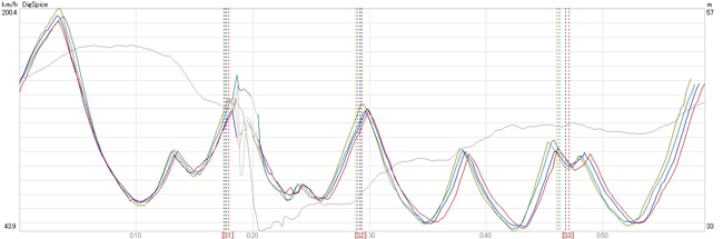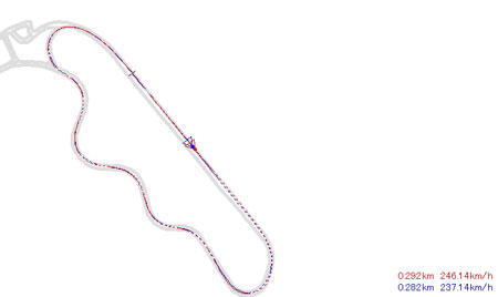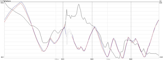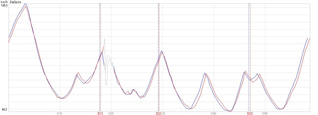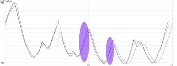 タイムアップは主にストレートと加速区間,グラフでも明らかに180km/h〜の加速の伸びが速い,という感じでした。