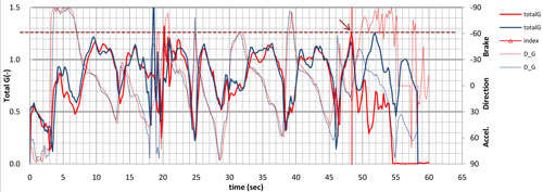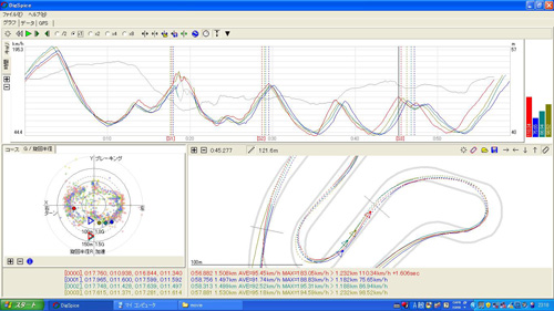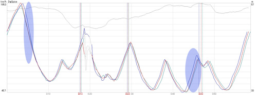 青→緑:1コーナーブレーキ〜3コーナー(0.1s),2ヘア立ち上がり加速(0.3s)