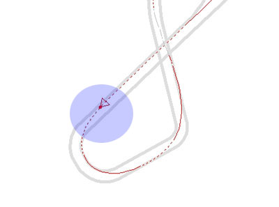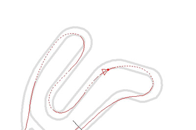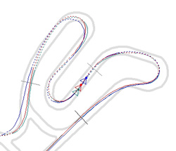 東コース。青=管理人。S字区間,寝かし込み/スロットルオフのポイント,最終立ち上がりのアウト側,etc....
